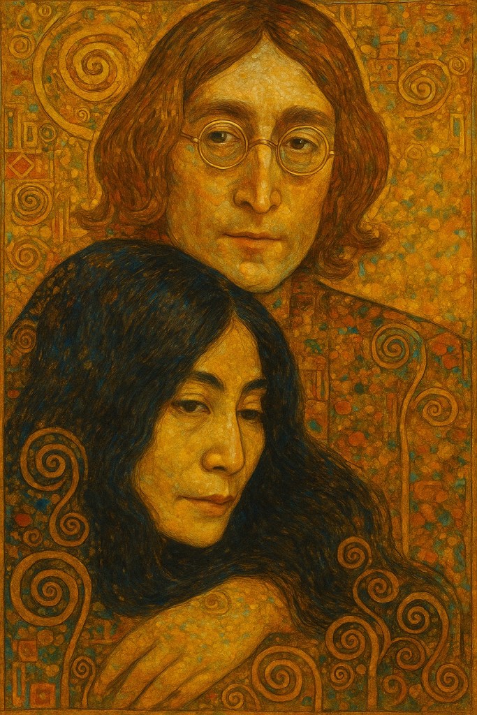 Les corps de John Lennon et Yoko Ono sont liés, enveloppés dans un manteau commun d’arabesques dorées — motif signature de Klimt — comme s’ils ne formaient plus qu’un seul être.