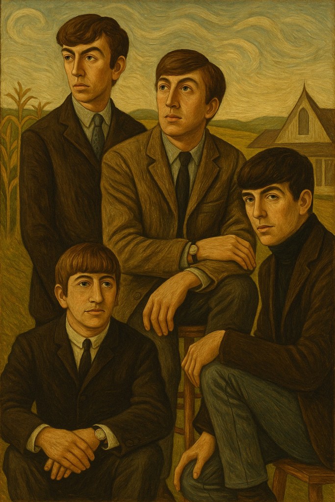 Le décor rural agit ici comme une métaphore du moment d’avant : avant la foule, avant le chaos, avant le mythe. Les Beatles apparaissent à la fois jeunes et déjà anciens, les visages graves, le regard tourné vers une grandeur encore invisible. Ce traitement correspond parfaitement à la manière dont Grant Wood abordait ses propres sujets : avec une forme de tendresse rigide, de modernité nostalgique.