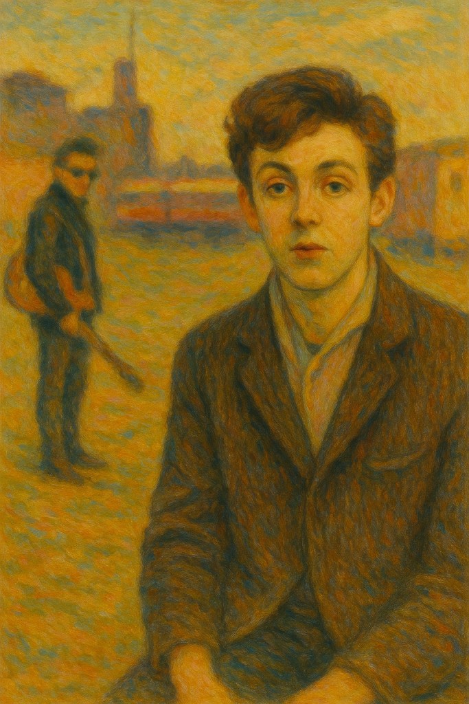 La palette dorée, la touche floue et la composition en miroir rappellent les œuvres de Cassatt centrées sur l’introspection féminine. Ici, le regard d’Astrid ne cherche pas à séduire : il capte l’instant suspendu d’une jeune artiste à l’orée d’une histoire qui la dépasse. La branche nue et la rose séchée évoquent à la fois la fragilité du moment et la mélancolie à venir, notamment liée à la disparition prématurée de Stuart Sutcliffe, compagnon d’Astrid et bassiste des Beatles.