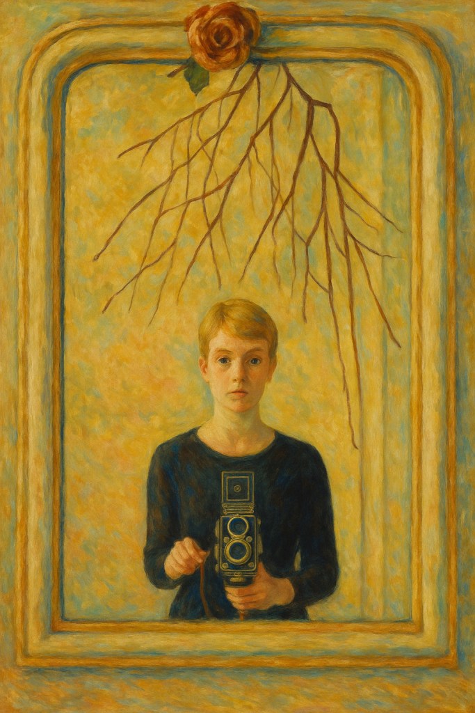 Le tableau présente une jeune femme vue en buste dans un miroir, tenant un appareil photo Rolleiflex à hauteur de taille. L’ensemble baigne dans une lumière dorée, tamisée, presque lactée, typique de la touche impressionniste. La figure se détache à peine d’un fond ornemental aux tons pastel – bleu clair, jaune paille, touches de rose – qui donne à la scène un aspect intime et suspendu. Une branche nue, suspendue au-dessus du visage, semble flotter dans le cadre comme une pensée. À son sommet, une rose fanée évoque le passage du temps ou la mémoire.