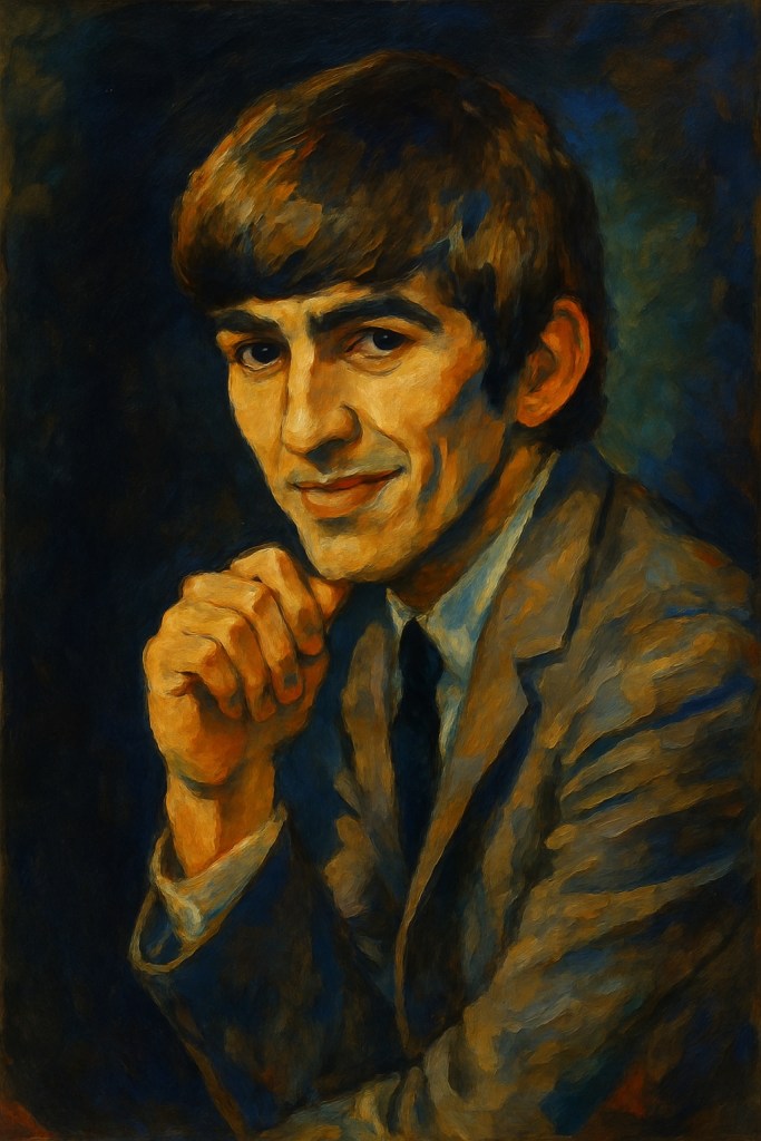 En représentant George Harrison comme un bloc pensif, Cézanne semble annoncer ce que sera son rôle dans les Beatles : une figure en retrait, moins bavarde, plus intérieure, mais fondamentalement structurante. Le regard tranquille et l’absence de tension mimique disent une conscience lucide du temps. C’est un portrait sans jeunesse apparente, où la maturité se dessine dans les volumes, pas dans l’expression. On n’est pas dans l’instantané, mais dans la permanence : George devient ici une figure stable au sein d’un monde instable — un roc, à la Cézanne.