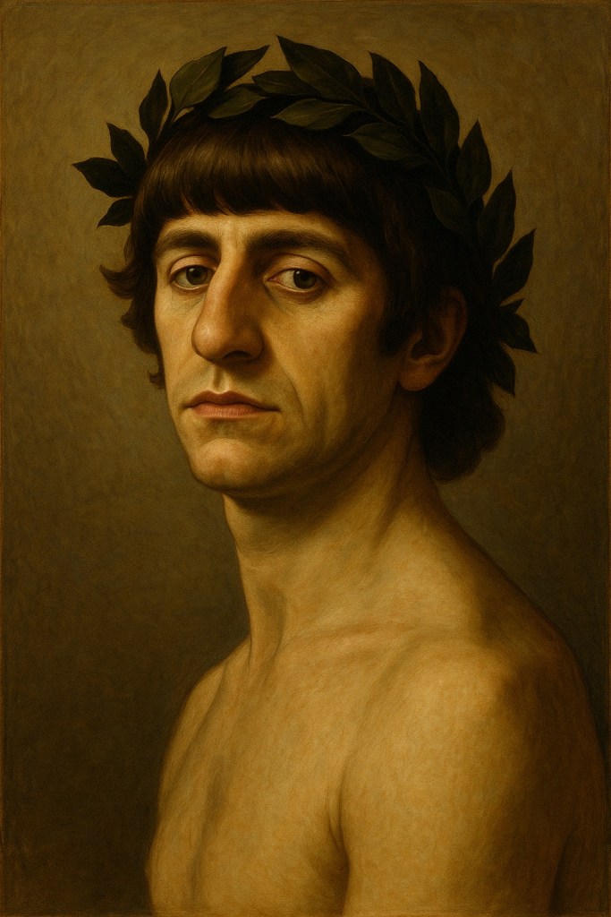 Ce tableau fait écho à une séance photo bien réelle : le 29 janvier 1965, Ringo Starr est photographié par Richard Avedon coiffé d’une couronne de laurier, dans un style évoquant l’Antiquité. Cette image, publiée dans le Daily Mail sous le titre « Hail, Ringo », marque une étape dans la construction iconographique des Beatles comme figures quasi mythologiques. Cette transposition picturale en peinture renaissante prolonge cette idée : l’artiste devient empereur, le musicien devient monument.