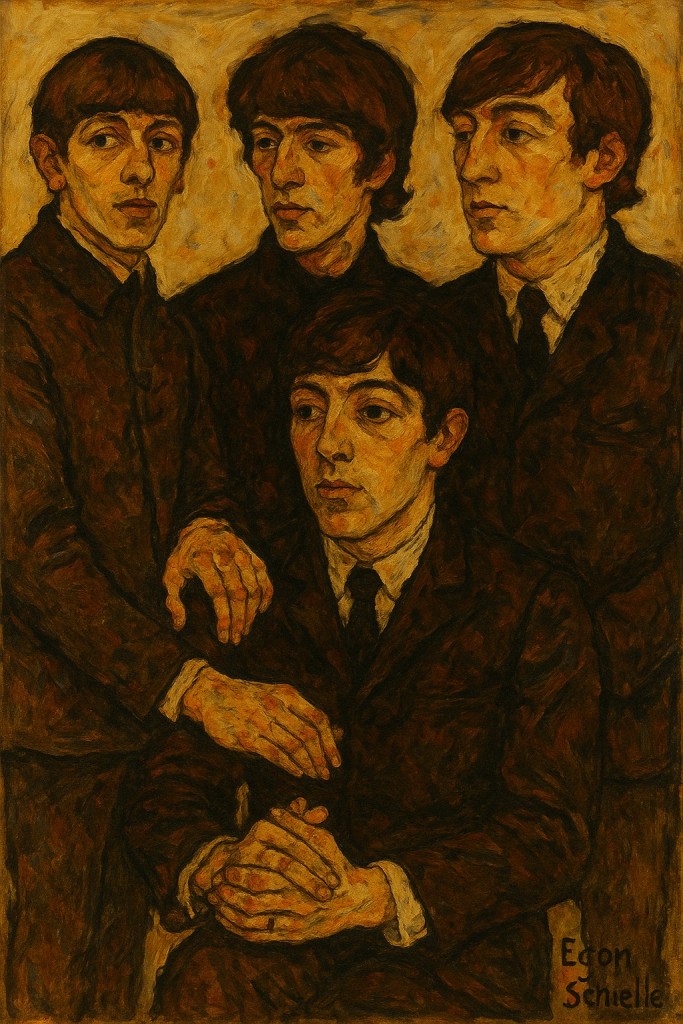 Cette œuvre révèle ainsi les Beatles à un point de bascule : épuisés, distants, écorchés, en pleine déconstruction de leur propre légende. Le traitement schielien donne à voir ce que la photographie ne pouvait qu’esquisser : la vérité de la fatigue et du doute sous la célébrité.