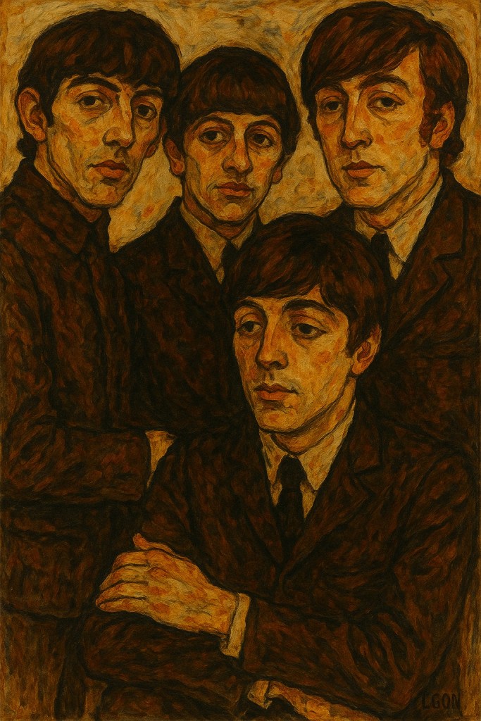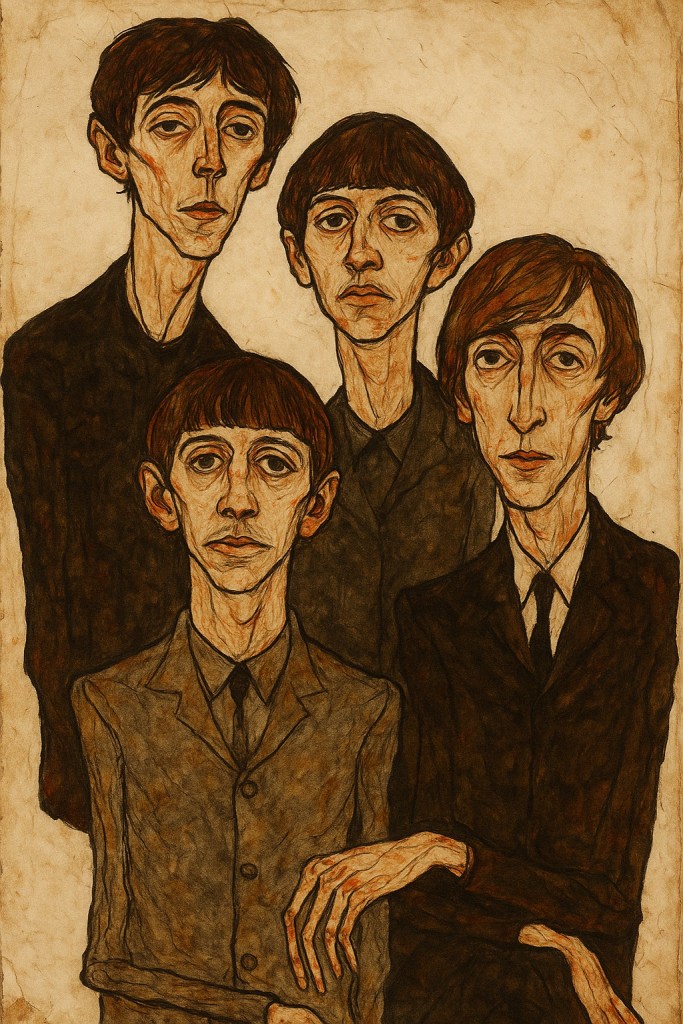 Dans Les Quatre Corps Intérieurs, Schiele (ou son double imaginaire) offre une lecture brutale, poignante, presque clinique du groupe pop le plus célèbre du monde. L’image devient confession : la gloire n’efface pas l’angoisse. Cette peinture transforme les Beatles non en icônes, mais en hommes en devenir, vacillants, à la lisière du renoncement ou de la transformation.