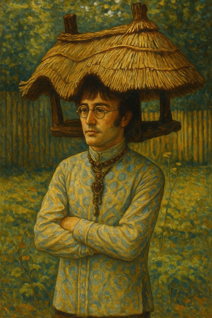 La scène montre John Lennon debout, bras croisés, vêtu d’un caftan aux motifs floraux rappelant les textiles russes traditionnels. Il se tient adossé à une mangeoire en bois sculpté au toit de chaume, qui semble posé comme un couvre-chef baroque sur sa tête. Le décor végétal foisonnant, la clôture rustique et les fleurs simples du jardin évoquent la douceur d’un été provincial, transformé en théâtre d’un imaginaire fantaisiste.