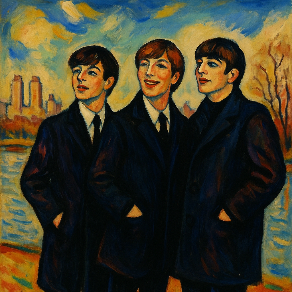 Nous sommes le 8 février 1964. La veille de leur première apparition au Ed Sullivan Show, les Beatles participent à une séance photo dans Central Park. George Harrison, malade, est absent. Ce tableau restitue cet instant où les trois membres encore méconnus du public américain découvrent la ville, les gratte-ciel, la neige — et eux-mêmes sous l’œil de dizaines d’objectifs. Le geste de John, pointant du doigt, est à la fois spontané et prophétique : un appel vers le ciel, vers le succès, ou une simple manière d’exister dans le cadre. Le style fauve souligne la tension entre leur fraîcheur enfantine et le destin monumental qui s’ouvre à eux.