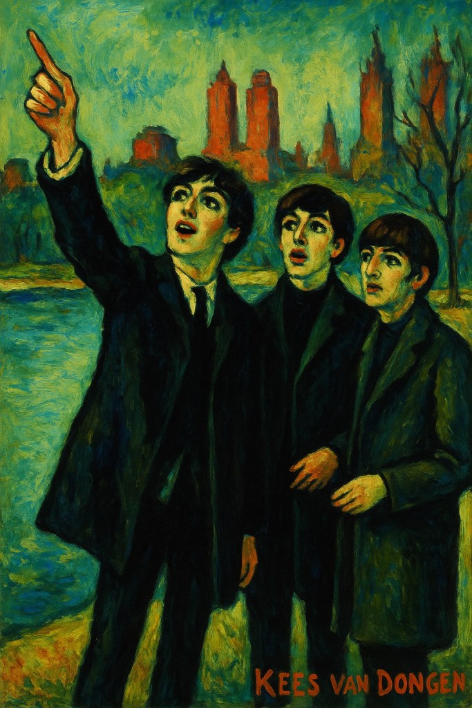 Dans cette scène colorée et expressive, trois Beatles — John, Paul et Ringo — découvrent New York la veille de leur passage au Ed Sullivan Show. Van Dongen saisit l’enthousiasme et la candeur d’un instant fondateur, transformant une simple séance photo en allégorie vibrante de la Beatlemania naissante. Le geste de John, pointant vers l’invisible, donne au tableau une force narrative : celle d’un groupe qui ne regarde pas son époque, mais l’avenir.