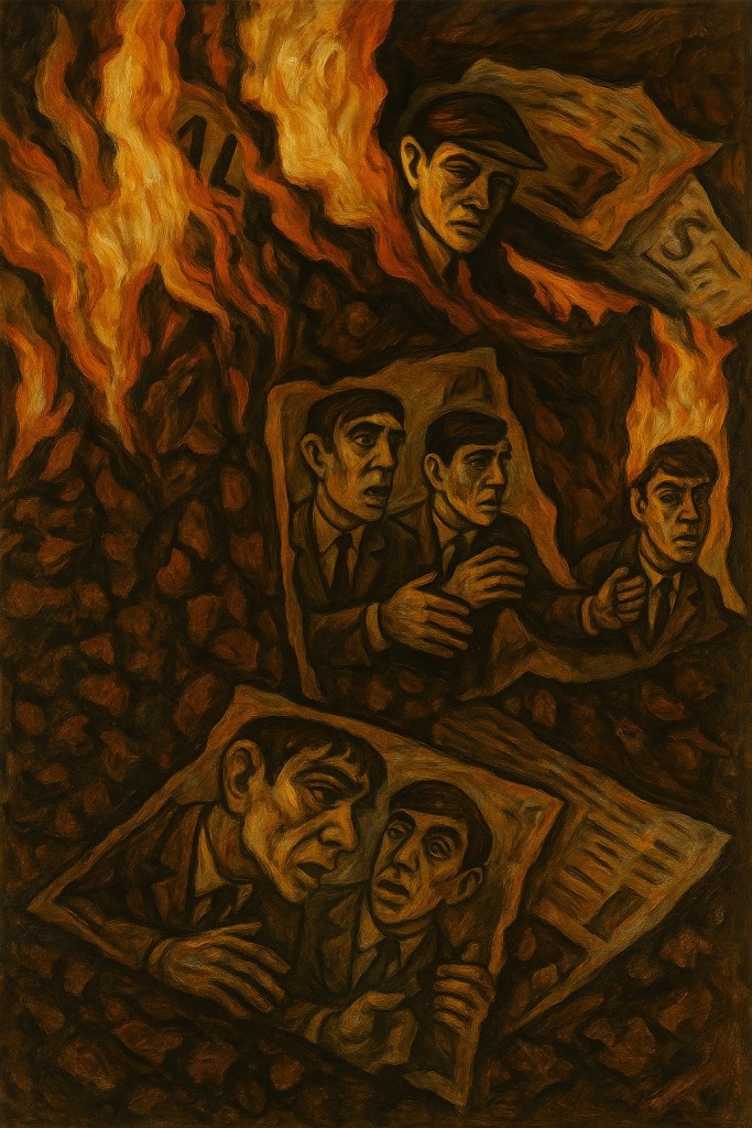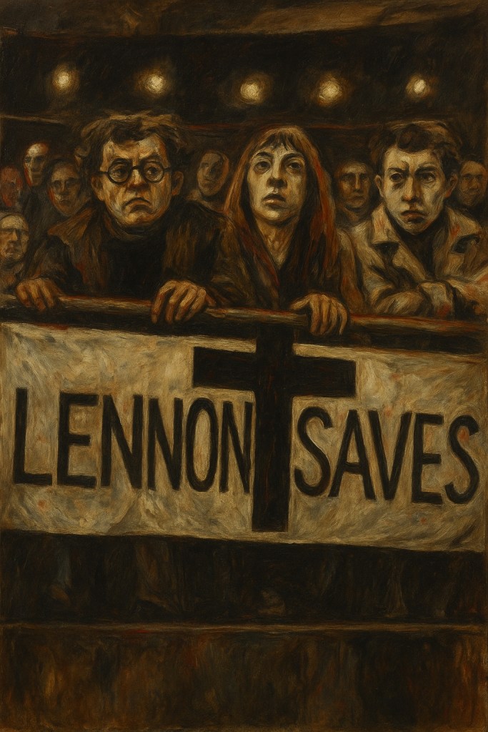 Ce tableau fictif, dans le style d’Otto Dix, montre avec brutalité le revers de la gloire : lorsque la célébrité devient blasphème, et que la foule réclame justice au nom d’une morale dévoyée. L’expressionnisme devient ici un miroir impitoyable tendu à l’Amérique des années 60 — et par-delà, à toute société prompte à brûler ce qu’elle a adoré.