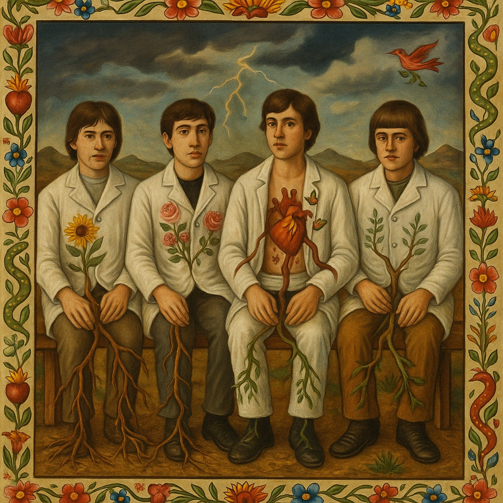 Ce tableau fictif transpose dans le langage symbolique et viscéral de Frida Kahlo une scène issue d’une séance photo provocante des Beatles. George Harrison, impassible, tient dans ses mains les clous du martyre, tandis que John Lennon, au regard révulsé, est transpercé, entouré de ronces, tel un saint laïque. Le cadre floral et les oiseaux exotiques ancrent l’œuvre dans l’imaginaire mexicain.