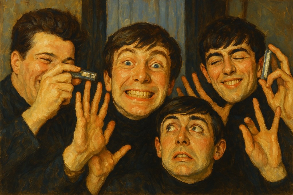 Dans cette peinture fictive, Wood ne se contente pas de reproduire le style naïf : il le pense comme une strate symbolique. La ville derrière Pete Best n’est pas simplement un lieu ; c’est un rêve matérialisé, une promesse picturale. Comme dans ses ports normands ou ses scènes marines, le décor devient un miroir de l’intériorité. La ville est ici celle d’un avenir projeté, d’un destin suspendu. Au moment où Pete Best vit ses dernières heures dans le groupe, l’œuvre ne raconte pas la fin mais le seuil — l’instant où l’on rêve encore. Tout y est théâtre, mais un théâtre tendre, mélancolique, dans lequel la jeunesse devient poésie.