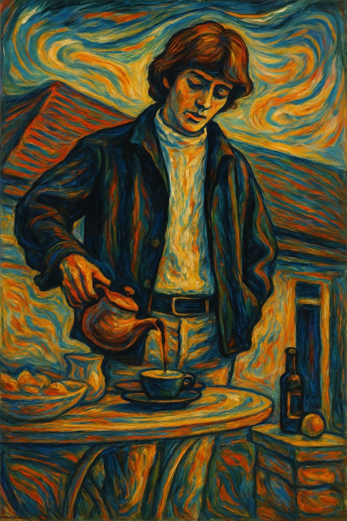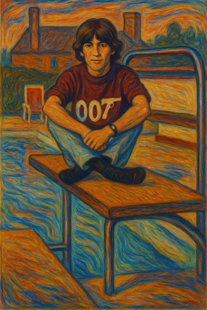 Les photos révèlent un George calme, discret, plongé dans ses objets familiers, préfigurant l’homme en quête spirituelle qu’il deviendra. Ce moment intime, loin du tumulte, correspond parfaitement à la tonalité introspective et mélancolique du tableau fictif inspiré de Munch.