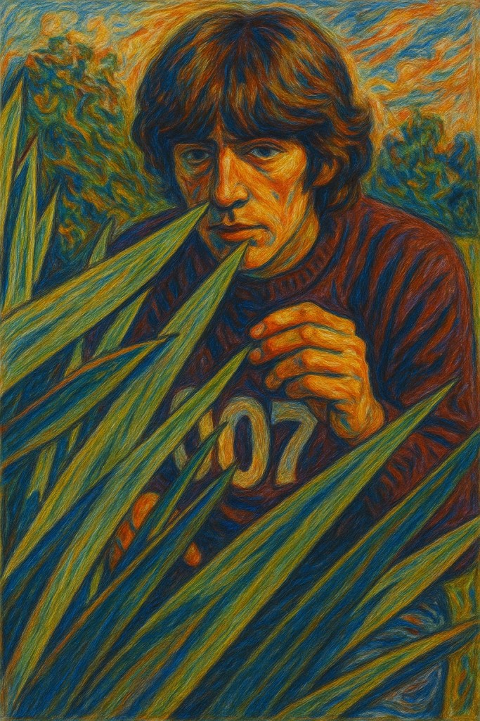 Ce portrait fictif de George Harrison s’inspire d’une séance photo de 1965, à une époque où le musicien s’éloigne peu à peu de la sphère publique pour chercher une forme de vérité intérieure. Dans cette œuvre, Edvard Munch aurait saisi non pas l’homme, mais l’onde psychique qu’il dégage : visage fermé, profil incliné, regard absent.
