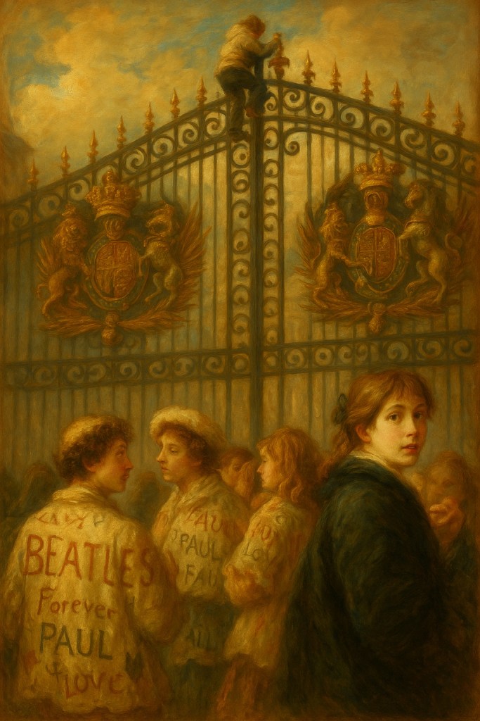 Au pied du portail, un groupe de jeunes admirateurs et admiratrices attend dans une ferveur rêveuse. Ils portent des manteaux couverts de slogans d’amour naïf — “PAUL”, “LOVE”, “BEATLES FOREVER” — écrits à la hâte comme des serments d’enfance. L’or des insignes royaux répond au rouge des lettres tracées à la main : la monarchie traditionnelle et la monarchie pop se font face.