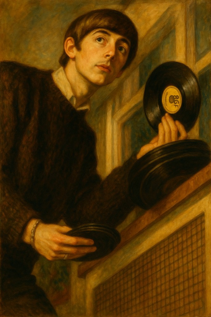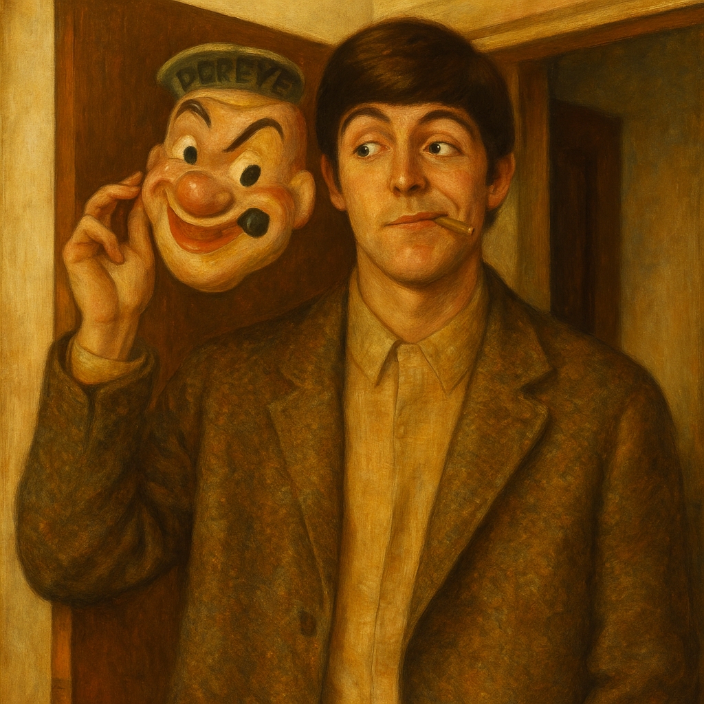 Cette peinture imaginaire frappe par sa dualité : drôle et mélancolique, précise et insaisissable. Elle illustre un moment suspendu de la carrière des Beatles, entre jeu et effacement, lumière et simulacre. Par son usage du masque et du clair-obscur, elle évoque à la fois le théâtre antique et le carnaval romantique. Un hommage pictural au moment exact où quatre garçons deviennent des silhouettes planétaires.