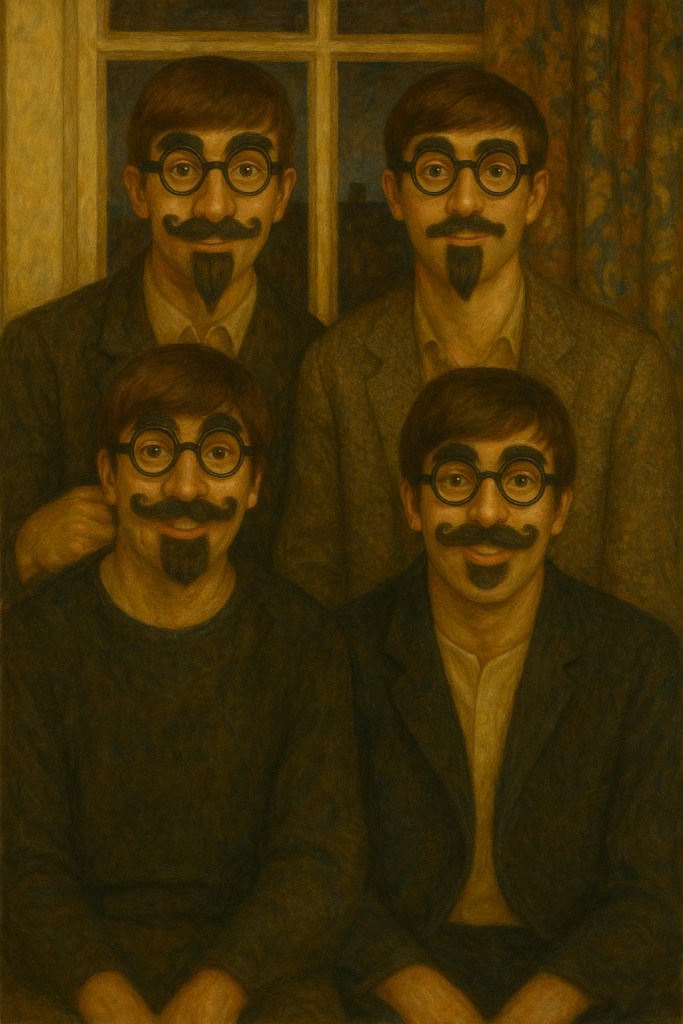 Le 11 octobre 1963, dans leur appartement du 57 Green Street à Londres, les Beatles reçoivent Sean O’Mahony, rédacteur du magazine The Beatles Book. Ils posent pour des photos improvisées, affublés de lunettes farfelues et de fausses barbes. Cette journée anodine précède de deux jours leur passage au London Palladium, point de bascule de la Beatlemania. L’œuvre imaginaire saisit ce moment-limite où les quatre jeunes hommes glissent de l’anonymat intime vers la dépersonnalisation publique. Le rire, les déguisements, les jeux d’enfant deviennent ici une métaphore de la dissolution des identités, à l’instant même où la célébrité s’apprête à les figer dans une image mondialisée.