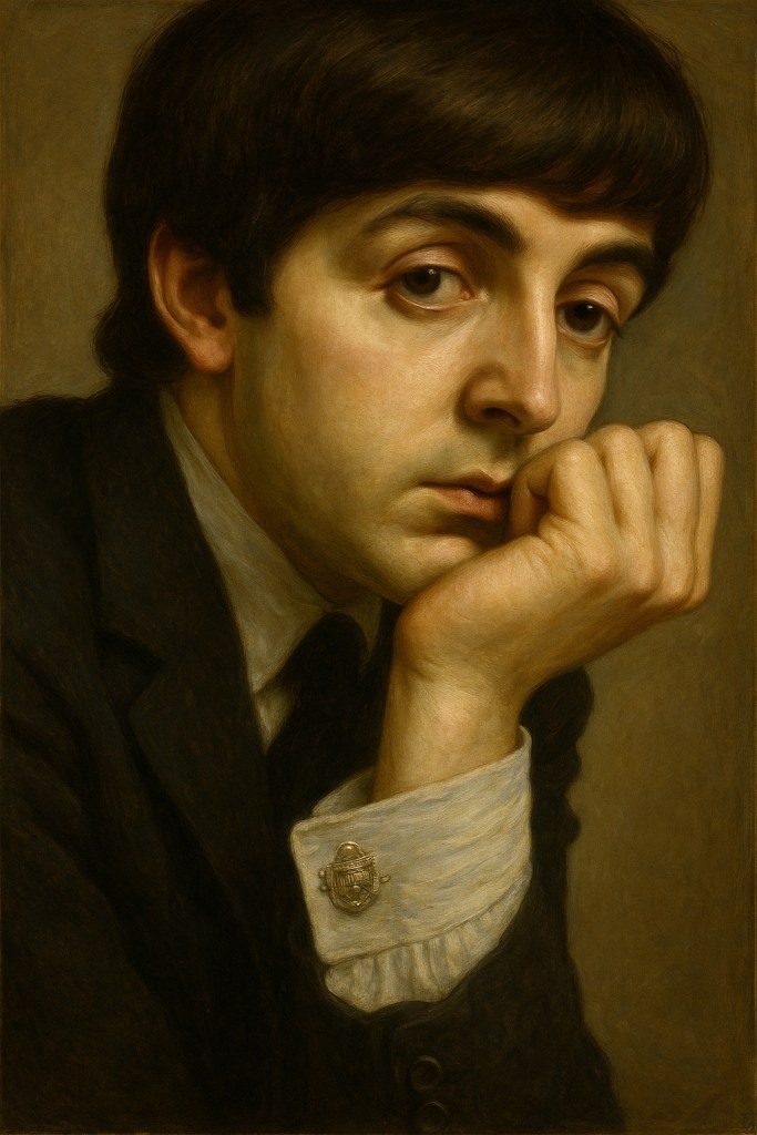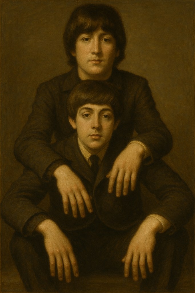 Cette peinture, à la manière des portraits de philosophes antiques, élève les deux musiciens au rang d’archétypes de la création duale : raison et passion, mélodie et verbe, lumière et ombre. Le style néoclassique n’est ici ni pastiche ni hommage figé, mais véritable transposition dans l’éternité artistique de figures pop encore contemporaines. En choisissant l’esthétique d’un Mengs pour immortaliser ce moment, l’œuvre affirme que Lennon et McCartney sont plus que des idoles populaires : ils incarnent une forme moderne de génie humaniste.