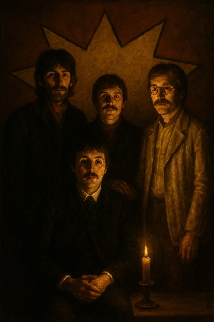 Ce tableau fictif, inspiré d’une photographie réelle des Beatles en 1967, détourne l’instantané médiatique pour en faire une image méditative.