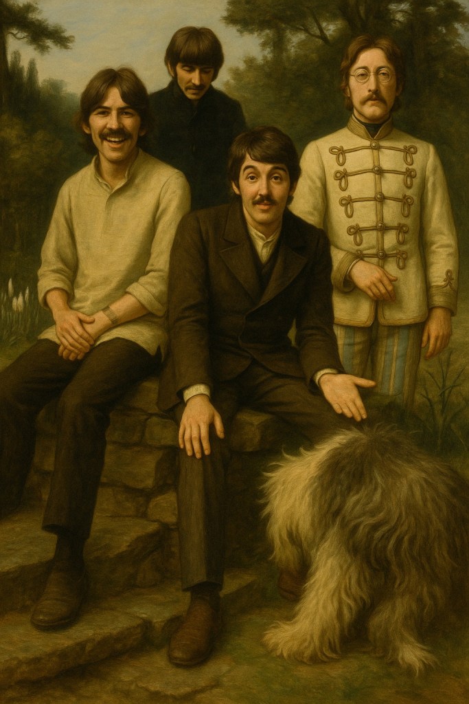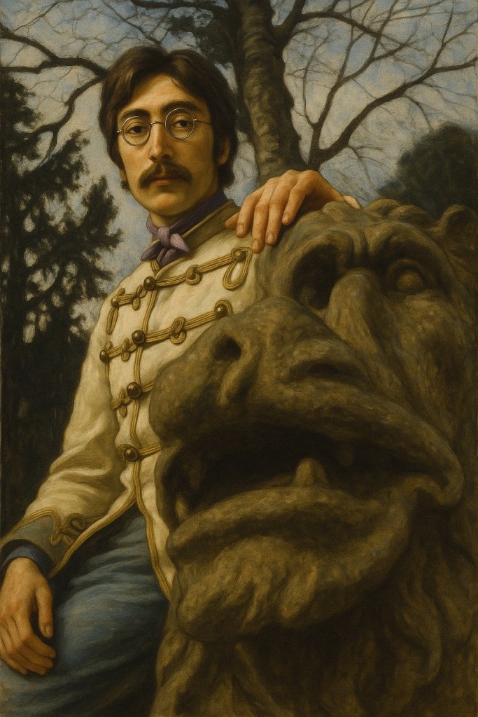 La scène s’inspire indirectement de la séance photo du 25 février 1967 réalisée par Henry Grossman à Sunny Heights, résidence de Ringo Starr. À l’approche de Sgt. Pepper’s Lonely Hearts Club Band, les Beatles modifient profondément leur image : tenues militaires psychédéliques, moustaches assumées, postures détachées. Lennon, tout particulièrement, s’empare de cette nouvelle iconographie pour cultiver une distance entre sa personne publique et intime. En replaçant ce visage moderne dans une esthétique du XIXe, l’œuvre interroge cette tension entre rôle et intériorité.