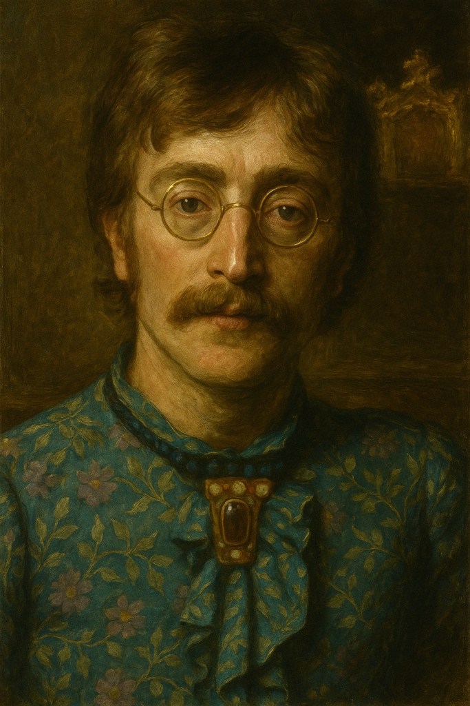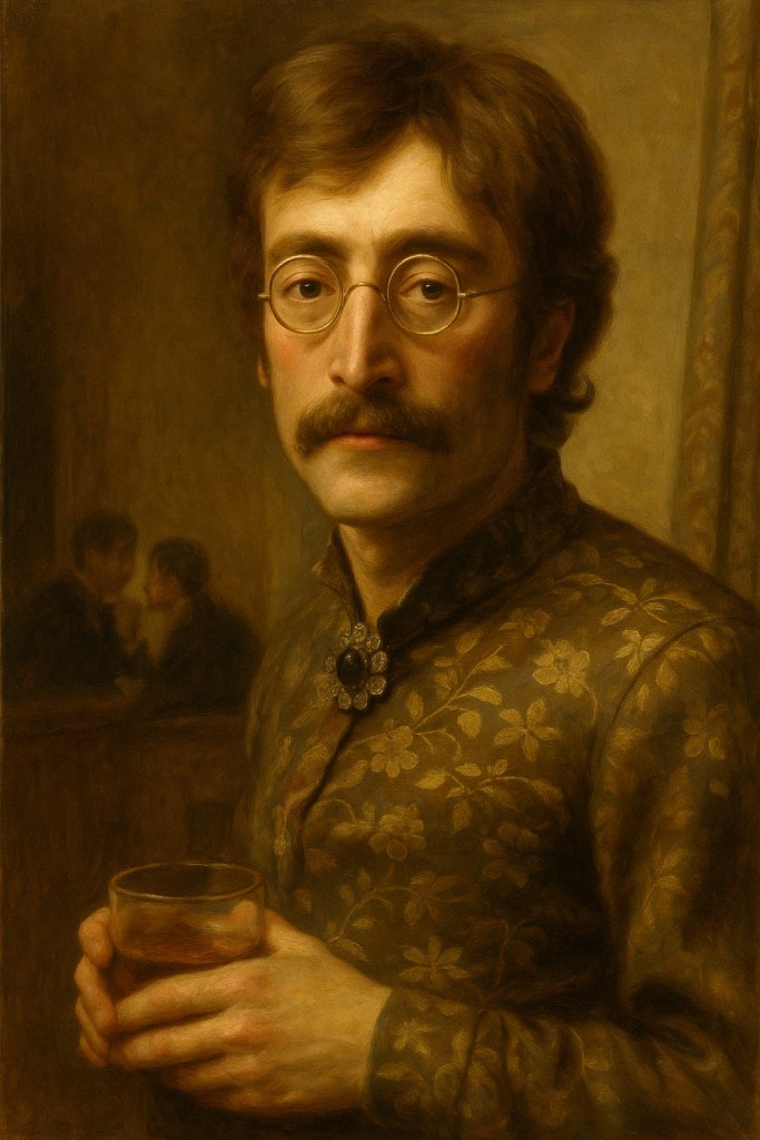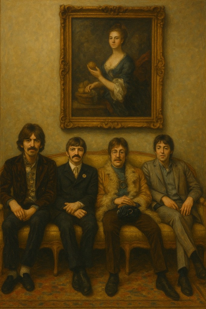 Dans cette mise en scène picturale, les Beatles apparaissent non plus comme les artisans d’un tube pop, mais comme des figures absorbées dans l’histoire de l’art. Le portrait féminin au-dessus d’eux, qui semble ignorer leur présence, incarne la tradition picturale, voire la critique implicite de l’immortalité. Le fruit tendu dans la main de la dame devient ici le symbole de ce que les Beatles s’apprêtent à saisir : une forme de postérité culturelle habituellement réservée aux aristocrates, aux saints ou aux philosophes. En se figeant ainsi, le groupe accepte de devenir légende, tout en gardant, dans leurs regards fatigués ou ironiques, un soupçon de lucidité.