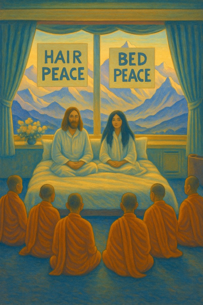 Dans cette composition empreinte de mysticisme, Nicholas Roerich aurait transfiguré le Bed-In de John Lennon et Yoko Ono en un rituel sacré de méditation universelle. Les deux artistes, assis en posture paisible sur un lit drapé de blanc, font face à un cercle de six moines bouddhistes. La chambre devient sanctuaire, et les pancartes « Hair Peace » / « Bed Peace » prennent valeur de mantras visuels suspendus entre les mondes.