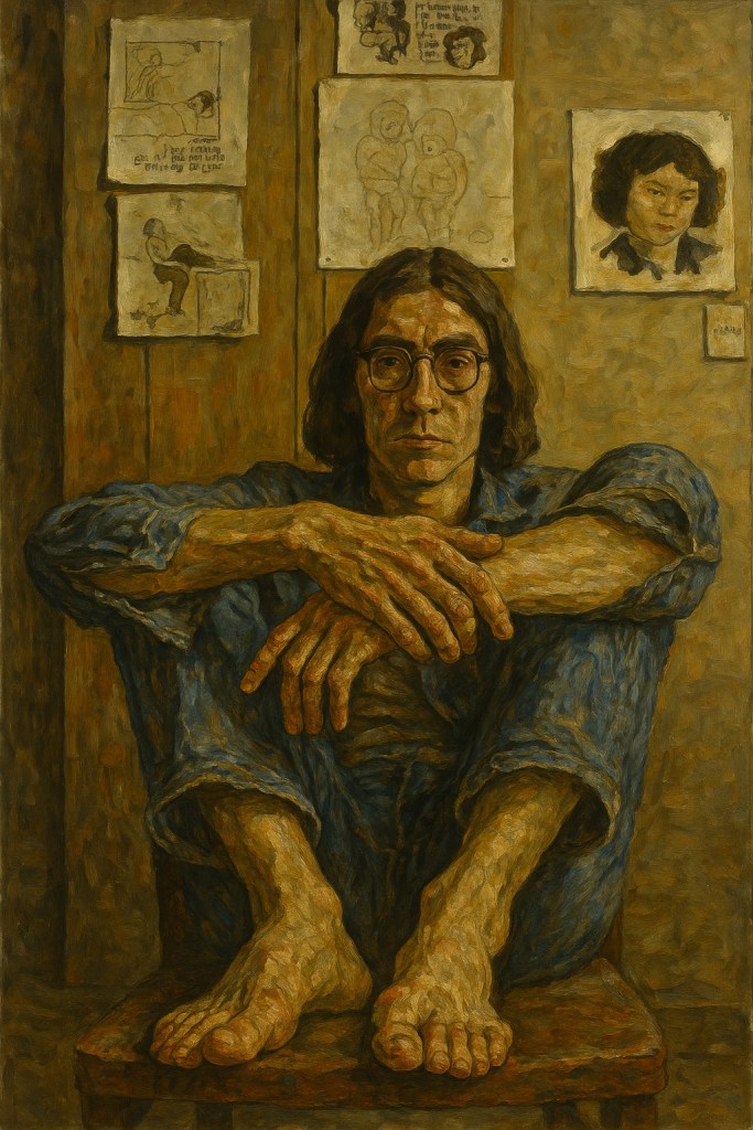 Dans ce portrait saisissant, attribué à Lucian Freud, John Lennon est représenté pieds nus, replié sur lui-même, dans un intérieur dépouillé aux tonalités ocres et terreuses. La matière picturale épaisse et la lumière crue exacerbent la tension physique du corps, figé dans une pose entre veille et retrait. L’aspect brut du bois, la rigidité du mobilier, la rugosité de la peau — jusqu’aux cernes, aux veines saillantes, aux pieds sales — traduisent l’implacable réalisme cher à Freud, qui ici s’attaque non à l’icône, mais à l’homme seul.