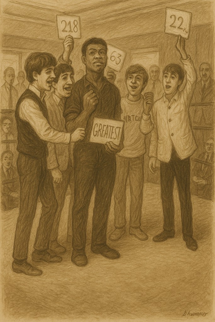Cette scène fait écho à un moment réel : le 18 février 1964, les Beatles — en pleine Beatlemania américaine — rendent visite à Cassius Clay (futur Muhammad Ali) à la salle d’entraînement du 5th Street Gym à Miami, quelques jours avant son combat contre Sonny Liston. Ce moment devient iconique : d’un côté, les quatre musiciens blancs, ambassadeurs de la jeunesse occidentale ; de l’autre, un jeune boxeur noir, charismatique, provocateur, invaincu, qui revendique son identité et sa puissance. Cette rencontre est autant un événement médiatique qu’un croisement symbolique entre la pop culture britannique et le mouvement afro-américain naissant.