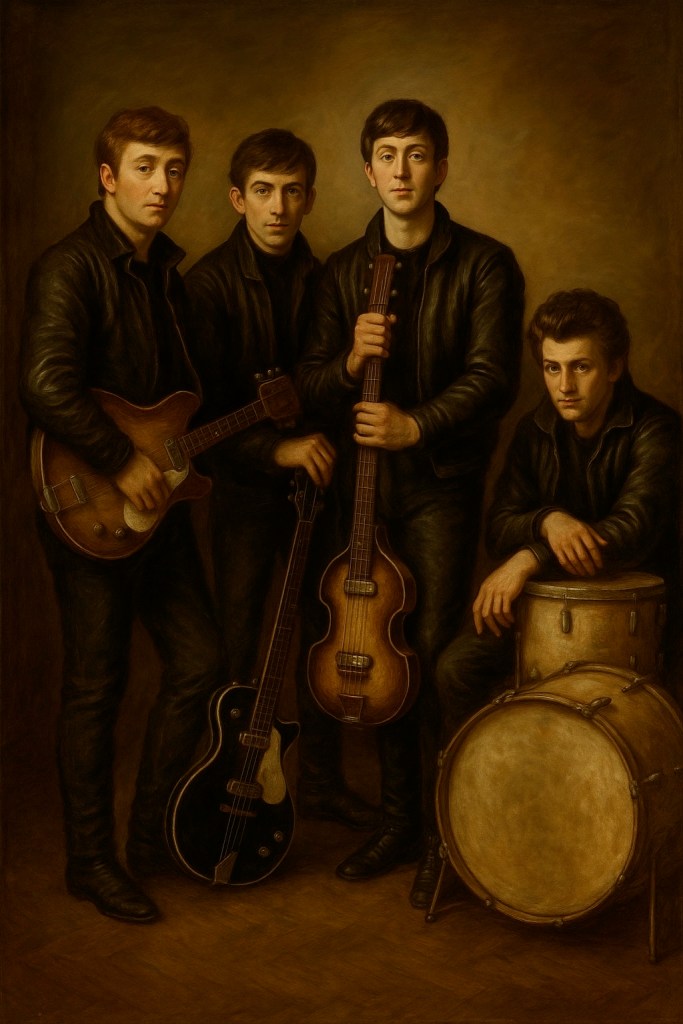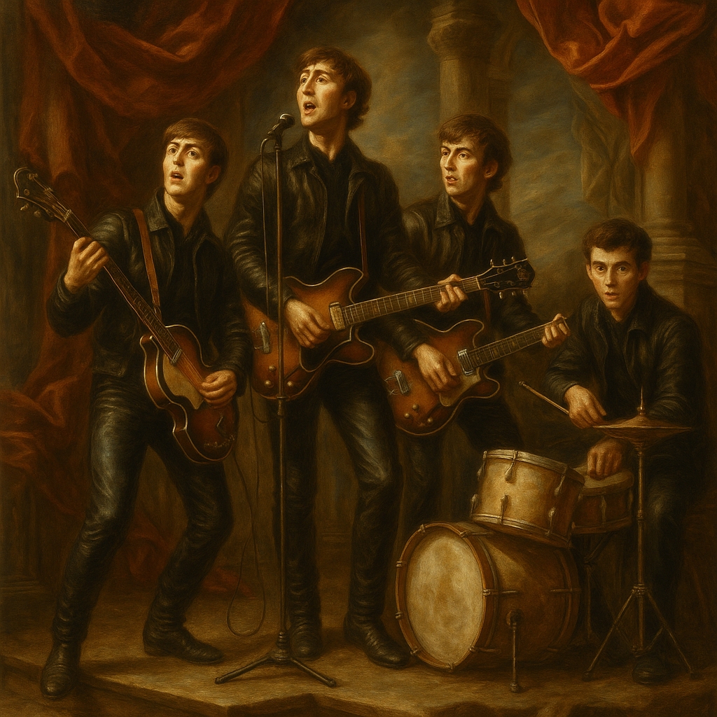 L’œuvre inventée ne cherche pas à représenter les Beatles « tels qu’ils étaient » en 1961, mais à traduire picturalement l’instant où l’invisible devient visible : le moment où des jeunes musiciens anonymes sont en passe de devenir des icônes culturelles. Le langage visuel hérité du baroque hollandais — ses codes sacrés, son goût pour la révélation silencieuse — permet de transfigurer cette banalité apparente. Le spectateur n’admire pas ici une photo retouchée, mais une vocation incarnée, dans la tradition même des peintures d’apôtres ou de compagnons d’art sacré.