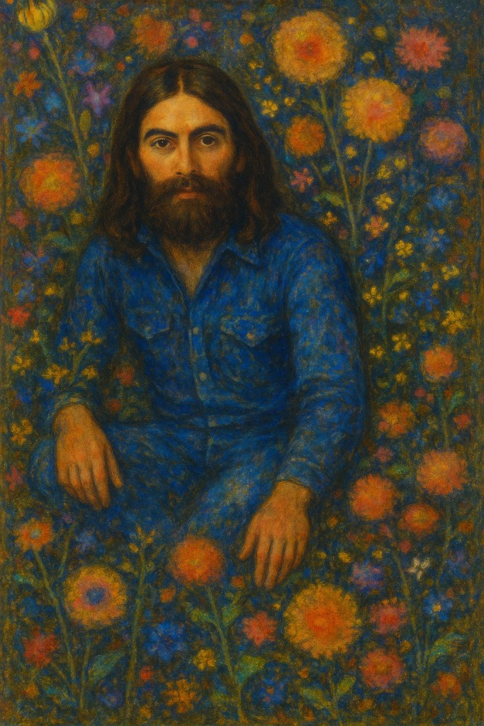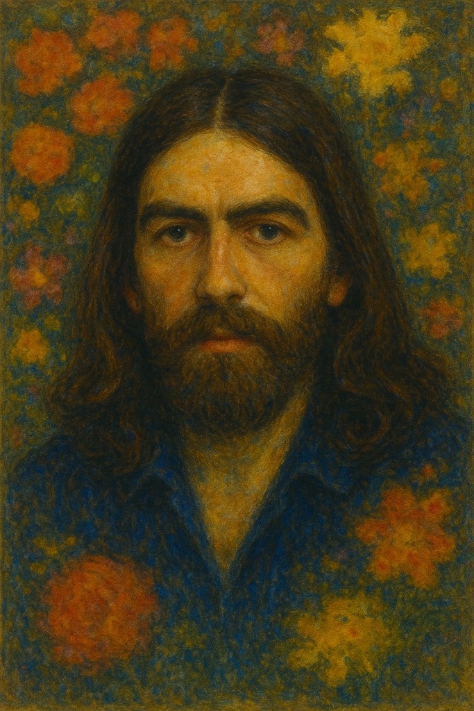 Cette œuvre attribuée à Odilon Redon n’est pas tant une image de George Harrison qu’un portrait spirituel. Elle traduit, par la symbolique florale et le traitement atmosphérique, un moment de bascule dans la vie du musicien — celui où le silence du jardin devient plus éloquent que le vacarme du monde. Loin du tumulte de l’actualité, ce tableau est un sanctuaire pictural.